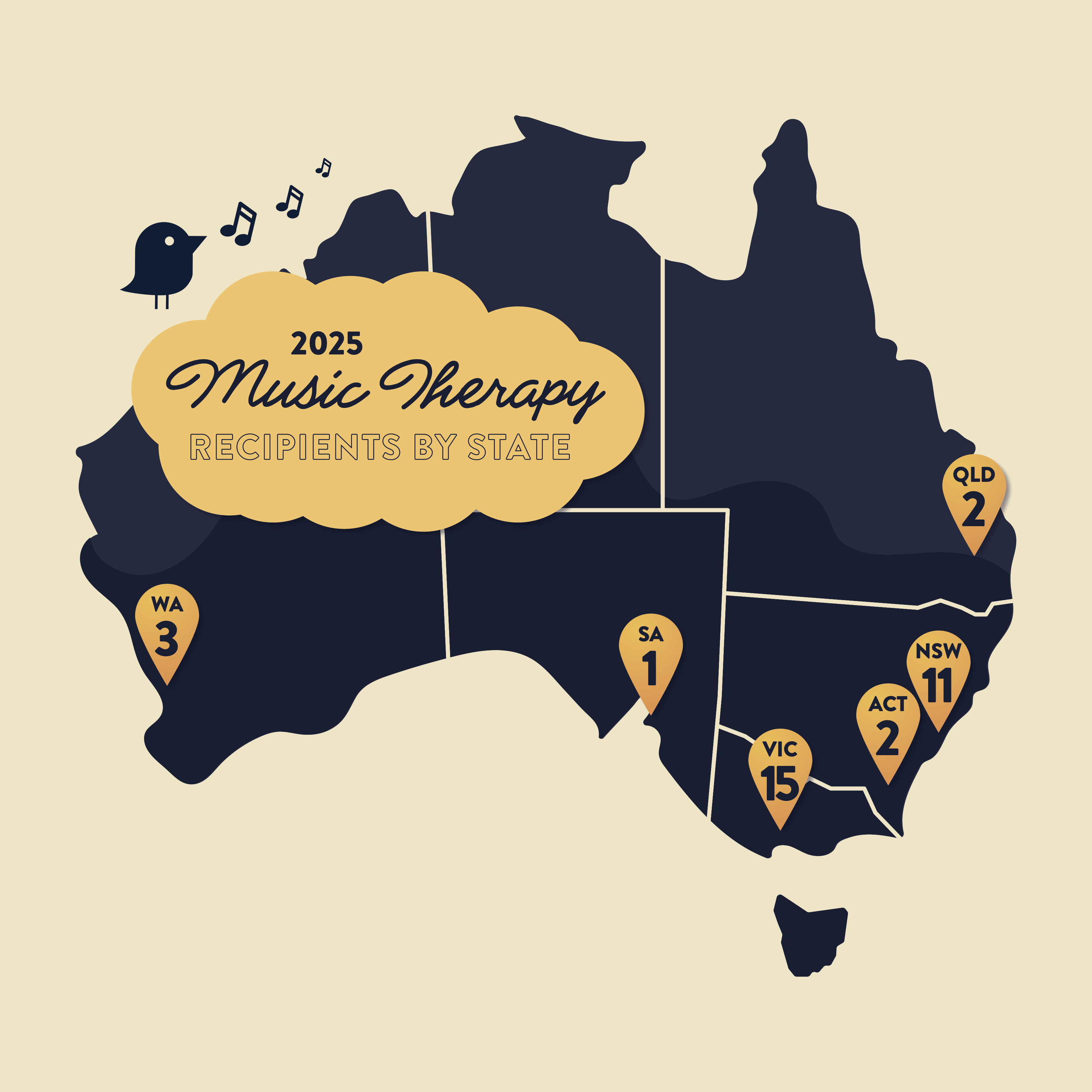 We are proud to provide a national in-home music therapy program and resource grants supporting children and young people aged 0–25, diagnosed with brain cancer. We currently have recipients in all states and territories (excluding Northern Territory).